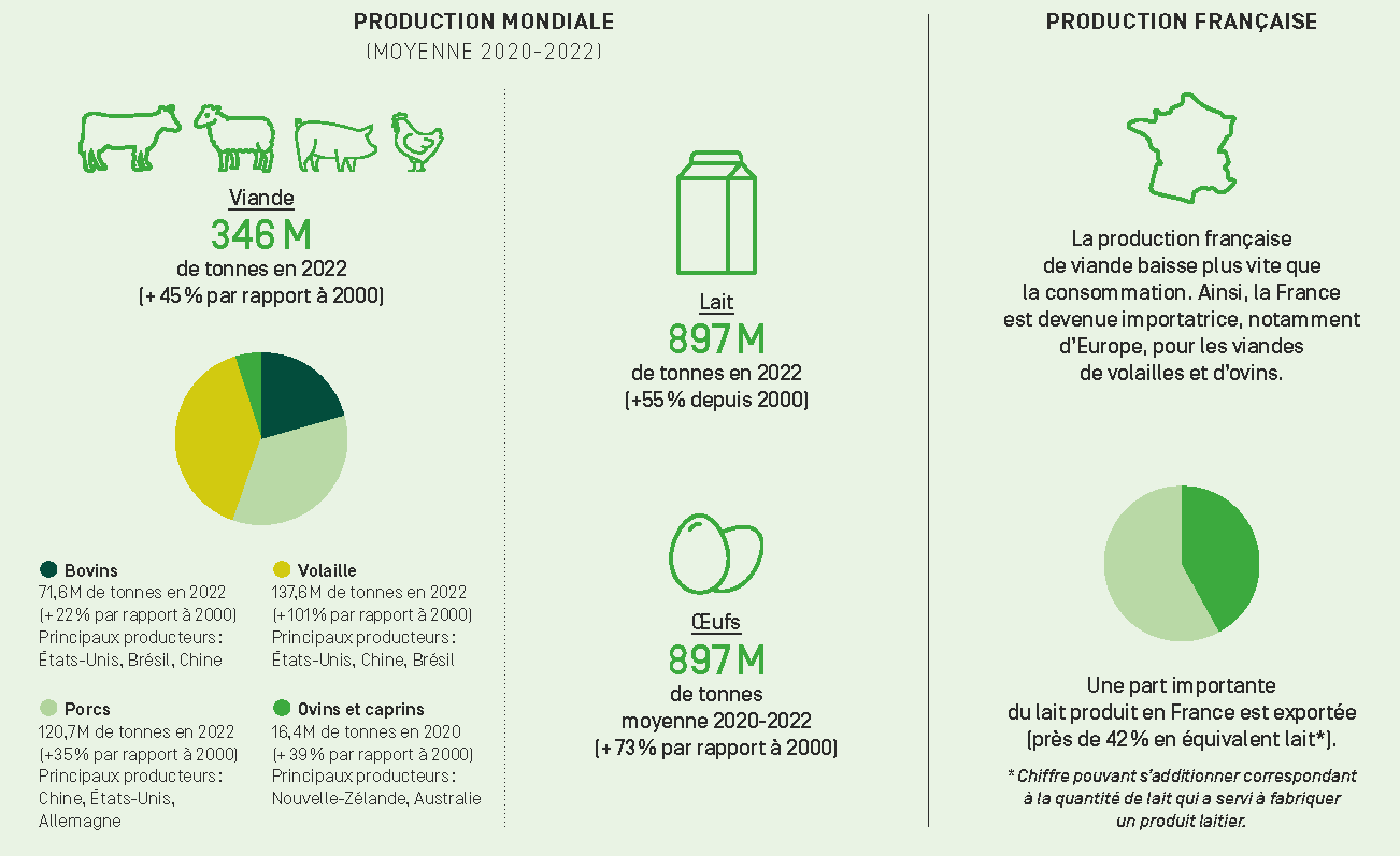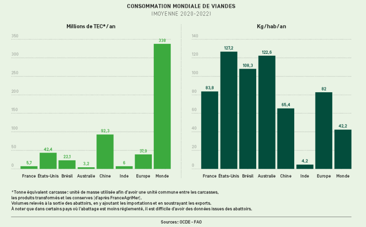 La consommation mondiale de viande a doublé depuis les années 1990, bien plus rapidement que l’augmentation de la population. Les Américains (du Nord et du Sud), les Australiens ou les Européens ont doublé leur consommation de produits animaux depuis 50 ans et mangent 2 fois plus de protéines d’origine animale que la moyenne mondiale. En Chine, la consommation de viande par habitant (65 kg en 2022) a quadruplé en 40 ans. La population indienne en revanche reste très faible consommatrice de viande (environ 5 kg/habitant/an), pour partie pour des raisons culturelles ou religieuses.