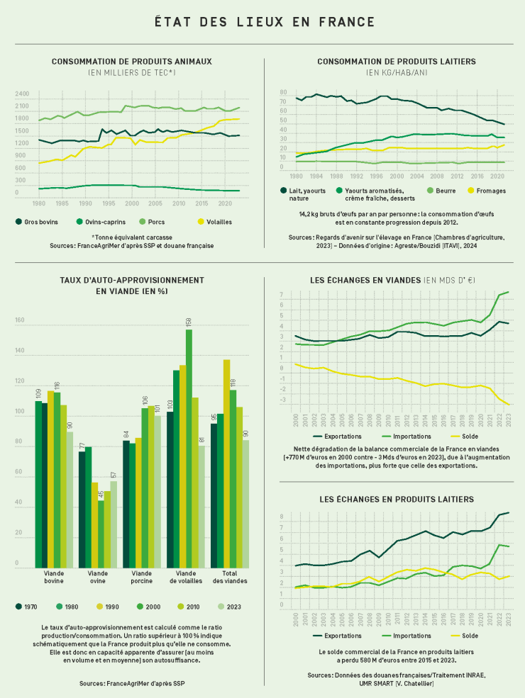 En France, après une baisse au début des années 2010, la consommation individuelle de viande connaît une très légère hausse depuis quelques années. C’est le résultat de la hausse de consommation des populations jeunes, en particulier de viande hachée, qui contrebalance le changement de régime de certaines populations pour des motivations diverses (par ex., environnement, bien-être animal) et l’augmentation d’une population âgée moins consommatrice. La proportion des différentes viandes, elle, se modifie, « en faveur des viandes de volaille ; celles de bœuf et des « autres viandes » (abats, équidés, lapins, gibiers) diminuent depuis le début des années 80 », comme le souligne le service de la statistique et de la prospective du ministère de l’Agriculture.