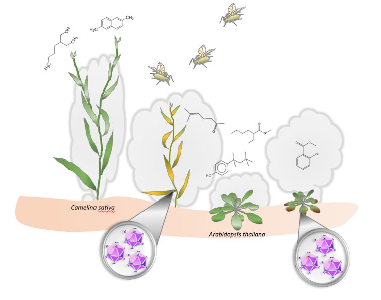 Illustration montrant l’attraction des pucerons par les Camelines infectées et non les Arabidopsis infectées. Véronique Brault/INRA, CC BY-NC-ND
