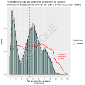 L’onglet Âge lors de la piqûre, disponible uniquement pour les êtres humains, présente l’âge qu’avaient les personnes au moment de leur piqûre, avec la possibilité de comparer ces données à l’âge de la population française (données INSEE au 1er janvier 2023). Cette comparaison met par exemple en évidence que CiTIQUE collecte peu de signalements chez les 15-25 ans, peut-être lié au manque de connaissances du programme CiTIQUE. Les chercheurs observent également une surreprésentation des enfants de moins de 10 ans qui incite à communiquer encore plus largement sur le risque auprès des parents, pour qu’ils prennent bien soin de vérifier que leur enfant n’a pas été piqué après une sortie dans des lieux à risque. En effet plus une tique est enlevée tôt, moins il y a de risque qu’elle transmette un agent infectieux si elle était infectée.