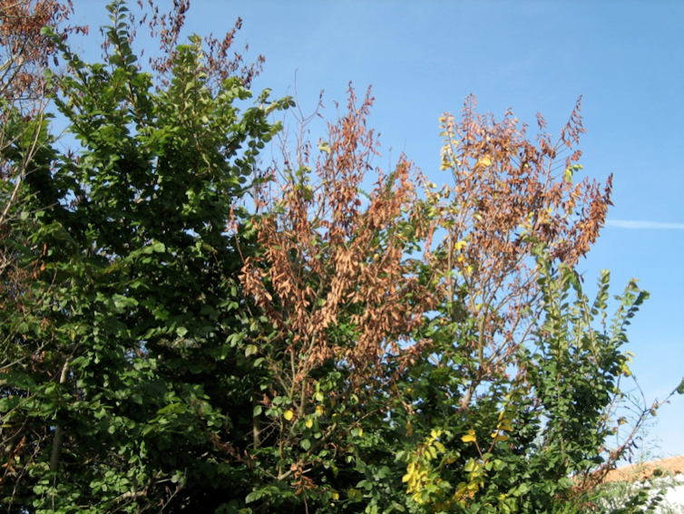 Flétrissement de branches d’ormes dû à la graphiose. INRAE Grand-Est-Nancy