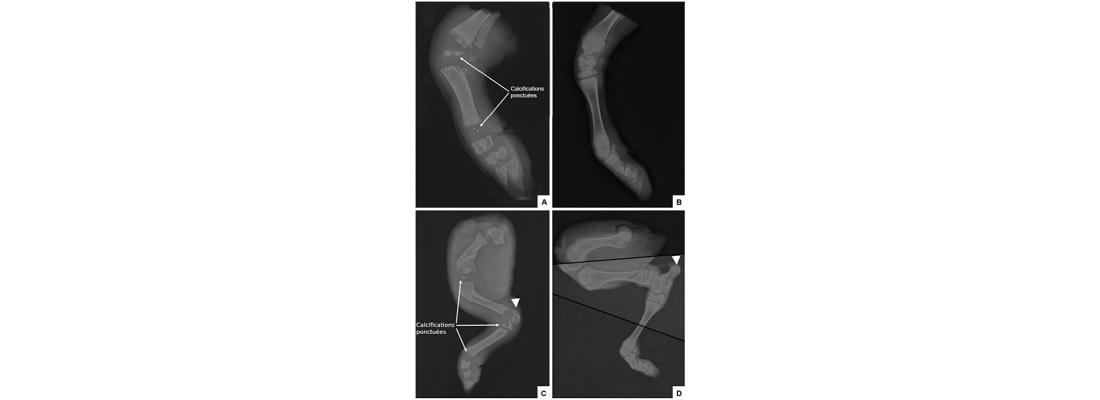 Figure : Radiographie des membres d’un veau atteint de chondrodysplasie ou sain. Membre antérieur d’un veau atteint (A) ou sain (B), membre postérieur d’un veau atteint (C) ou sain (D). Le triangle blanc indique l’emplacement de la tubérosité du calcanéum, absente chez le veau atteint.