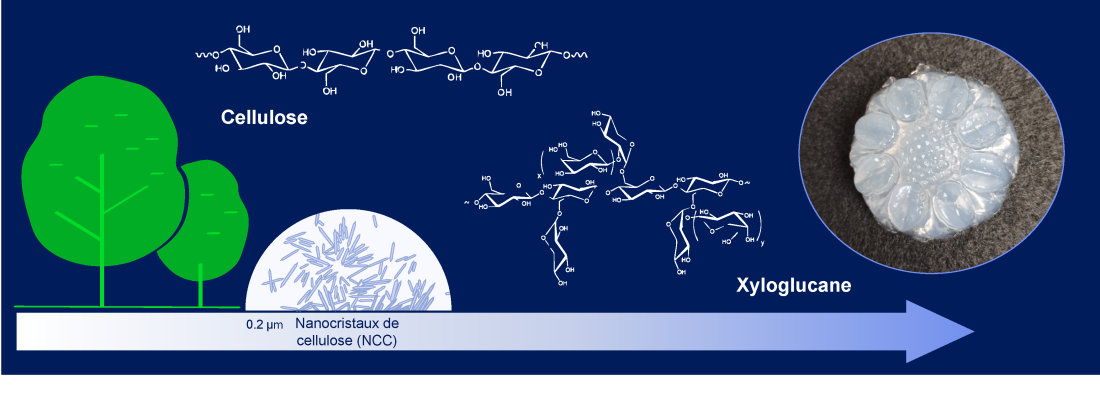 Les nanocristaux de cellulose (NCC) sont connus pour leur résistance mécanique provenant de leur structure cristalline et sont souvent utilisés comme renfort mécanique dans les composites. En revanche, le xyloglucane (XG) est un polymère soluble dans l’eau, mais montrant une faible résistance mécanique. Initialement, les dispersions aqueuses de NCC seuls et la solution de XG seule se comportent comme des liquides. Cependant, en les mélangeant, ces 2 biopolymères interagissent entre eux formant des gels stabilisés ou hydrogels. Ces interactions déterminent les propriétés finales des hydrogels.