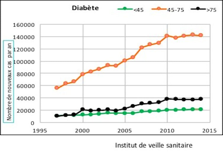 Incidence du diabète de type 2 en France entre 1997 et 2014 selon les classes d’âge. (source : Institut de veille sanitaire, IVS) Author provided