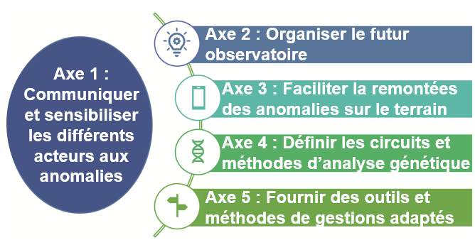 - Des protocoles et fiches d’aides à la décision de remontées, d’analyse génétique et de gestion des anomalies pour faciliter le fonctionnement de l’observatoire à chaque étape, depuis la découverte de l’anomalie jusqu’à sa gestion dans les populations.