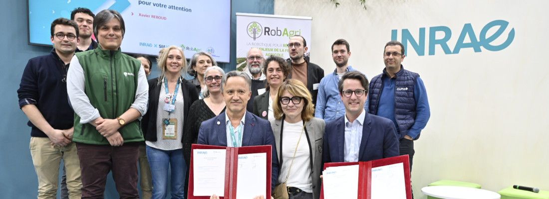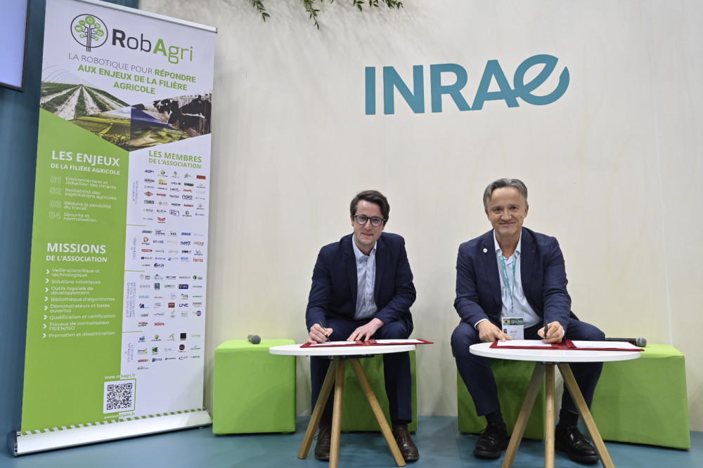 COMMUNIQUÉ DE PRESSE - À l’issue d’une conférence professionnelle dédiée à la robotique au Salon International de l’Agriculture, Philippe Mauguin, PDG d’INRAE, et Christophe Aubé, président de l’association RobAgri, ont signé une nouvelle convention de partenariat pour structurer, sur 5 ans, une collaboration ambitieuse au croisement de la recherche scientifique et de l’innovation industrielle. Ensemble, ils entendent renforcer les synergies entre chercheurs, roboticiens, agroéquipementiers et agriculteurs afin d’accélérer le développement et l’adoption de solutions robotiques performantes, sûres et adaptées aux transitions agroécologiques.