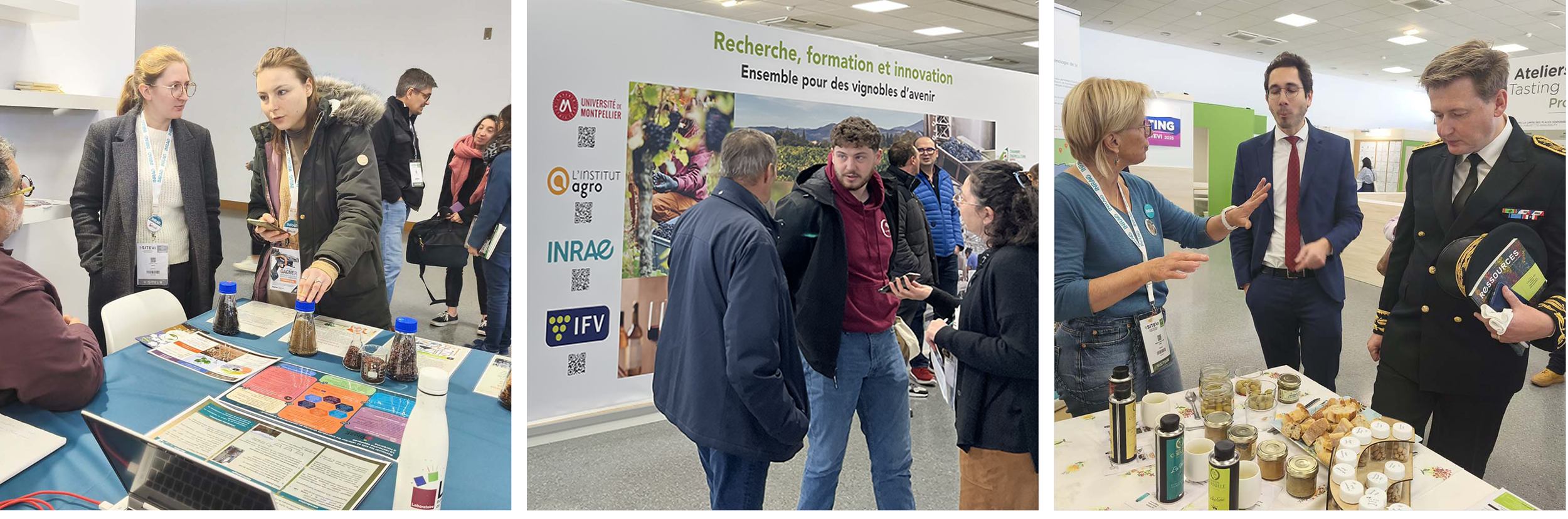 Côté animations, INRAE a proposé plusieurs démonstrations. Des ateliers sur la valorisation des coproduits viticoles et oléicoles — biogaz, biomolécules, compost — ont été proposés par le LBE de Narbonne et sa plateforme Bio2E. L’UMR AGAP était représentée via le projet Phen’Olive sur la diversité des oliviers comme sources potentielles de diversification des exploitations viticoles. L’UMR ITAP a présenté des démonstrations autour de la protection durable du vignoble, avec des modules de formation à la pulvérisation (projet Néopulvé). Enfin plusieurs entreprises essaimées par les unités de recherche d’INRAE et de ses partenaires, notamment dans le cadre du PUI étaient présentes pour illustrer les solutions numériques. Les dégustations organisées avec l’IFV et SudVinBio ont permis de découvrir les profils sensoriels des variétés résistantes, étudiés par des dispositifs participatifs d’analyse des perceptions comme par exemple ceux du défi Clé Vinid’Occ (travaux de l’UMR INNOVATION).