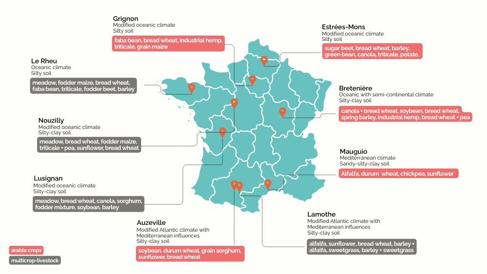 Rés0Pest, created in 2012 as part of a call for projects under the Ecophyto DEPHY EXPE programme, looked at nine original cropping systems that used no pesticides but did have the option to use ploughing and synthetic fertilizers. These systems were developed during co-design workshops held in nine locations in France with extension specialists, farmers and researchers. The workshops covered a wide range of pedoclimatic conditions and socioeconomic contexts (five arable cropping systems and four multicrop-livestock systems including temporary meadows) within INRAE’s network of experimental units, which are open-air labs managed by the Institute’s engineers and technicians.